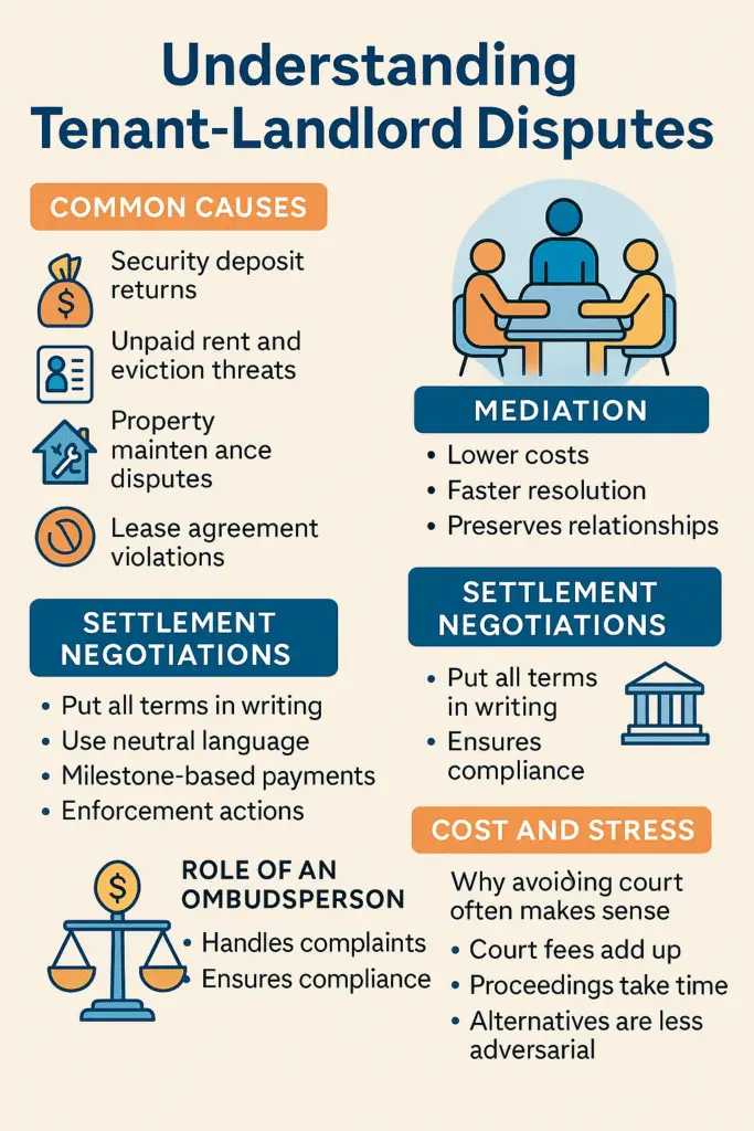 Tenant-landlord disputes arise from everyday issues tied to lease agreements, property maintenance, and financial obligations. Disagreements may involve unpaid rent, failure to return a security deposit, housing code violations, or conflicting interpretations of lease terms. While many tenants and landlords think immediately of Small Claims Court or Rent Court, filing a claim isn’t the only option. In fact, court costs, filing fees, and strict court procedures can be overwhelming. Exploring alternative dispute resolution can often save time, money, and relationships.