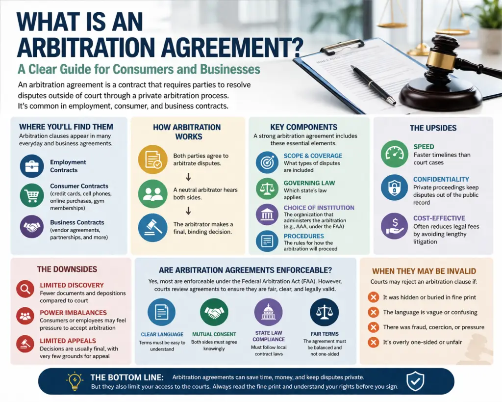 This article cuts through the confusion and explains exactly what arbitration agreements are, how they work, and what you should know before signing one.