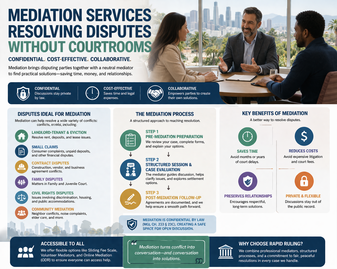 At Rapid Ruling, our focus is structured communication, efficient case management, and guiding disputing parties toward resolution in a peaceful manner. Whether the matter involves Small Claims, contract disputes, healthcare providers, or civil rights disputes, our Mediation Services prioritize clarity, confidentiality, and practical solutions.